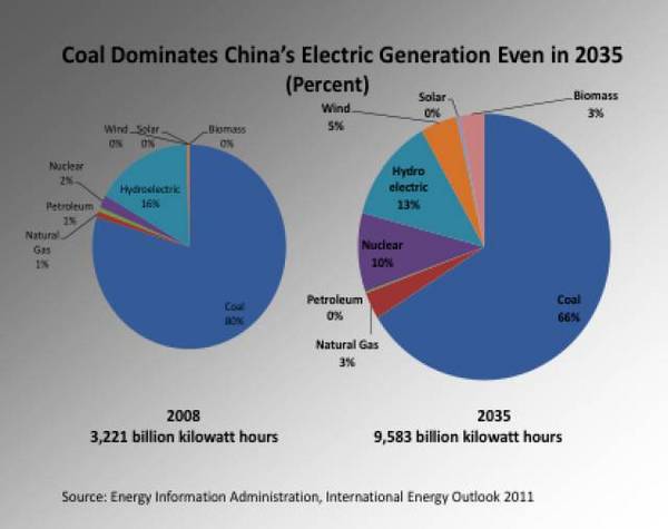 “The trendy belief that China is switching to renewables for its electricity generation is a myth.” That’s the conclusion of a report issues last week by the Energy Research Institute in Washington. In particular, the report states that 1) China continues to build coal plants at a phenomenal rate and will still be using coal to generate 66 percent of its electricity by 2035, and 2) the huge bulk of windmills and solar panels being manufactured in China are strictly for export, shipped to gullible Western countries whose governments are mandating and subsidizing the pursuit of “renewable energy.” (The report is posted above in “Research.”) “The Energy Information Administration (EIA), in its International Energy Outlook 2011, expects China to build 1,020 gigawatts of generating capacity between 2008 and 2035, of which almost half (48 percent) is expected to be coal-fired,” says the report. “China’s coal-fired capacity is already about 80 percent higher than that of the United States and by 2035, it is expected to be more than 200 percent greater. Hydroelectricity is also expanding rapidly. “China has more hydroelectric generating capacity than the United States—about 120 percent more—and is expected to build another 188 gigawatts, slightly more than its 2008 inventory, according to the EIA.” And nuclear will also play a big part, expanding to ten times its current capacity. “Some Chinese officials have announced that hydroelectric and nuclear generating capacity will make up most of the country’s targets for clean energy in their most recent 5 year plan that requires 50 percent generation from renewable sources by 2050.”